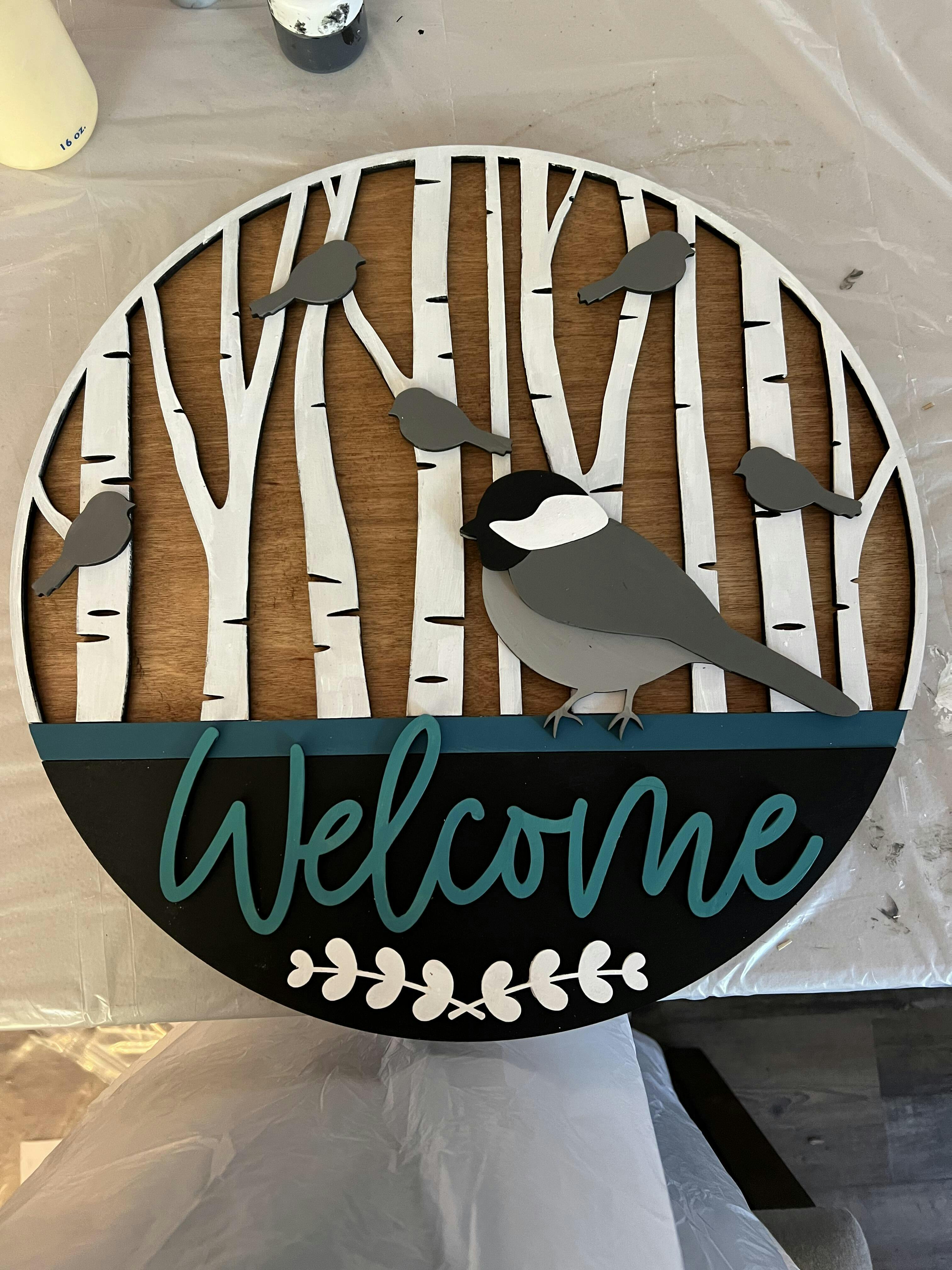 Bring a cheerful touch to your entrance with the Welcome sign with birds. Crafted from high-quality wood and MDF, each 12", 15" or 18” round piece features charming birds perched on birch bark, adding a playful and sturdy welcome to your home. Perfect for brightening up any doorway with a bit of nature fun!